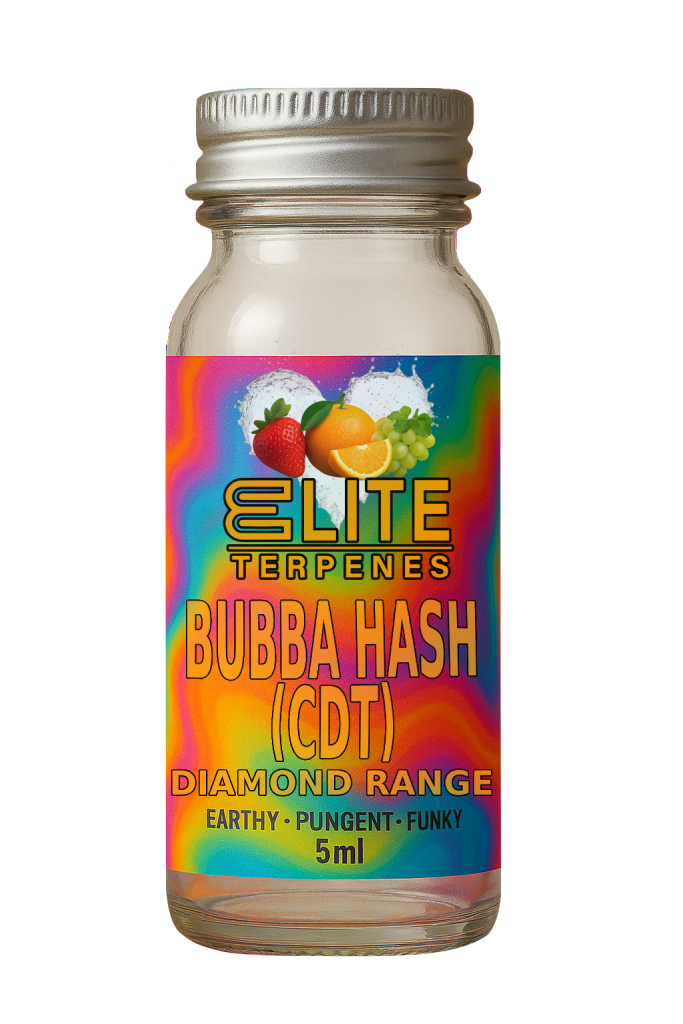 Bubba Hash (CDT) Terpene presents a rich and complex flavor featuring deep earthy hash notes blended with spicy pine, roasted coffee, and dark chocolate, finished with subtle skunk and fuel undertones.